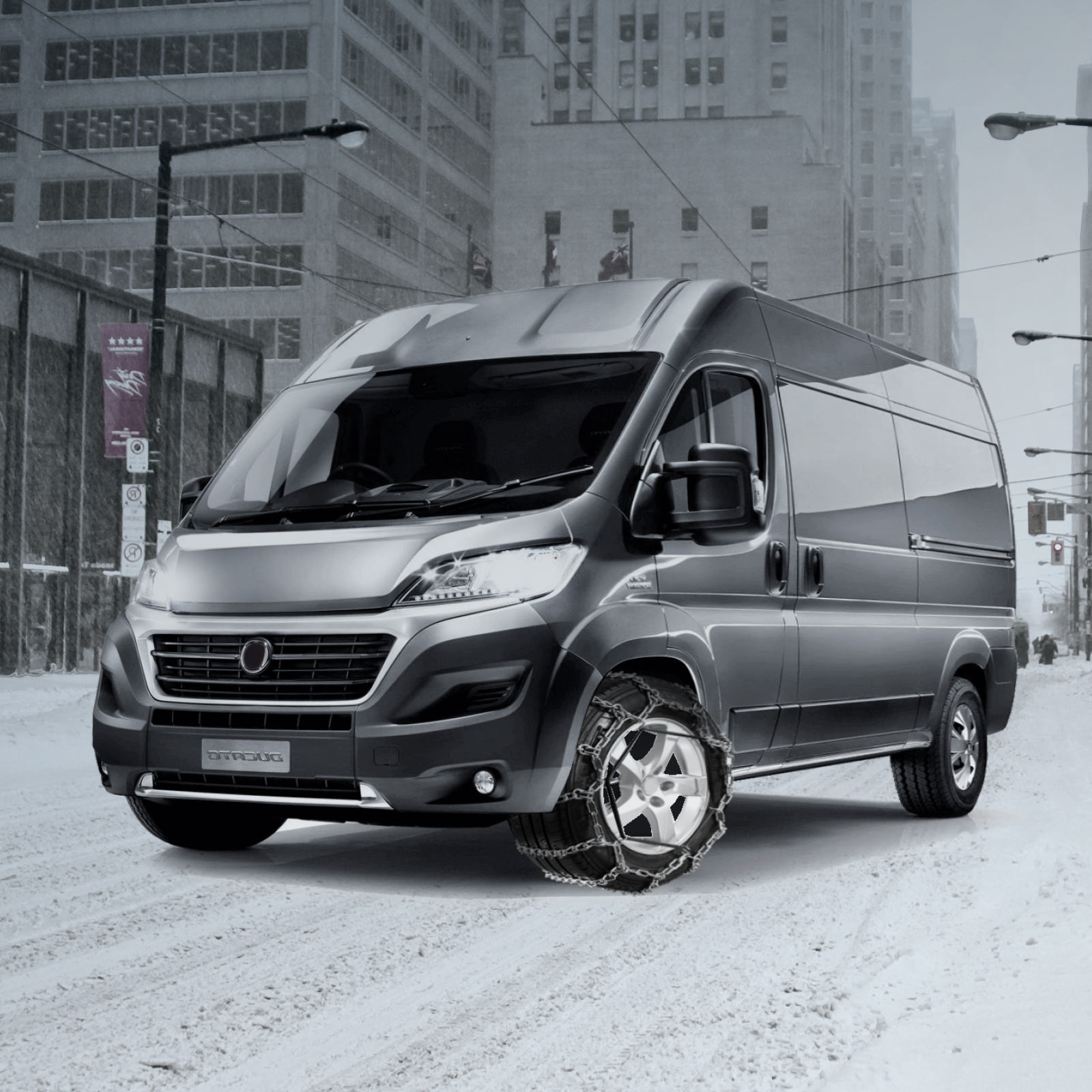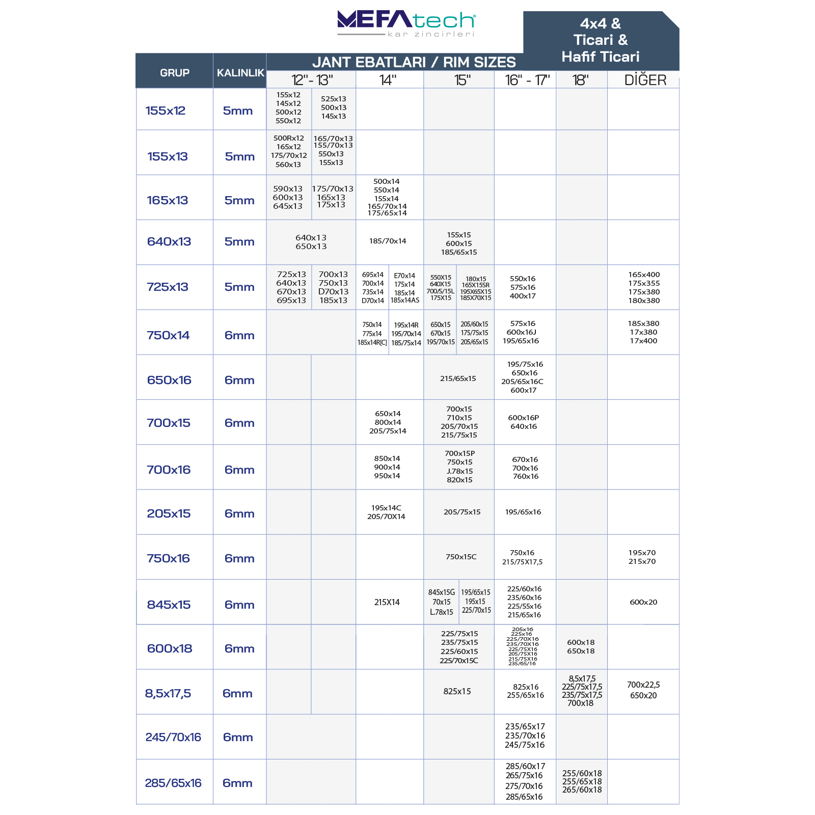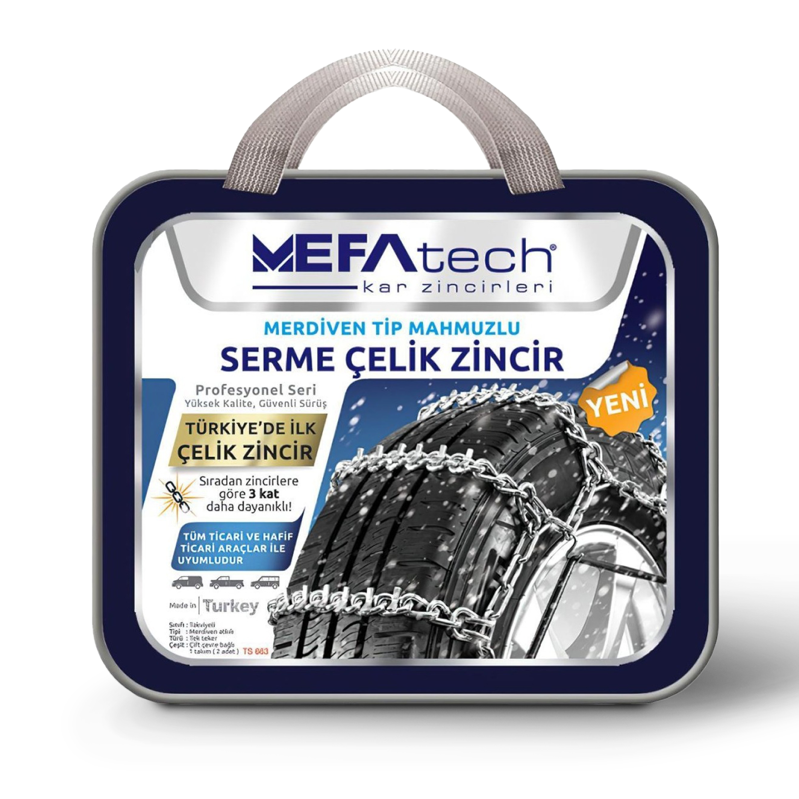 Ticari ve hafif ticari araçlar için üretilen, çelik mahmuz (V-Bar) destekli zincir sistemi.